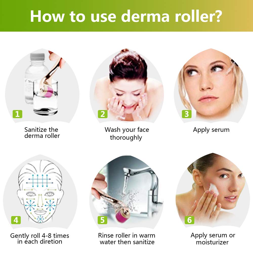 رأس ديرما رولر يشبة البَكرة وتحتوى هذة البَكرة على مئات الابر الصغيرة والدقيقة وهى التى تعمل على تحفيز انتاج الكولاجين اما باقى الجسم فهو عبارة عن يد طويلة ذو تصميم انسيابى لتمكنك من استخدامها بسهولة .